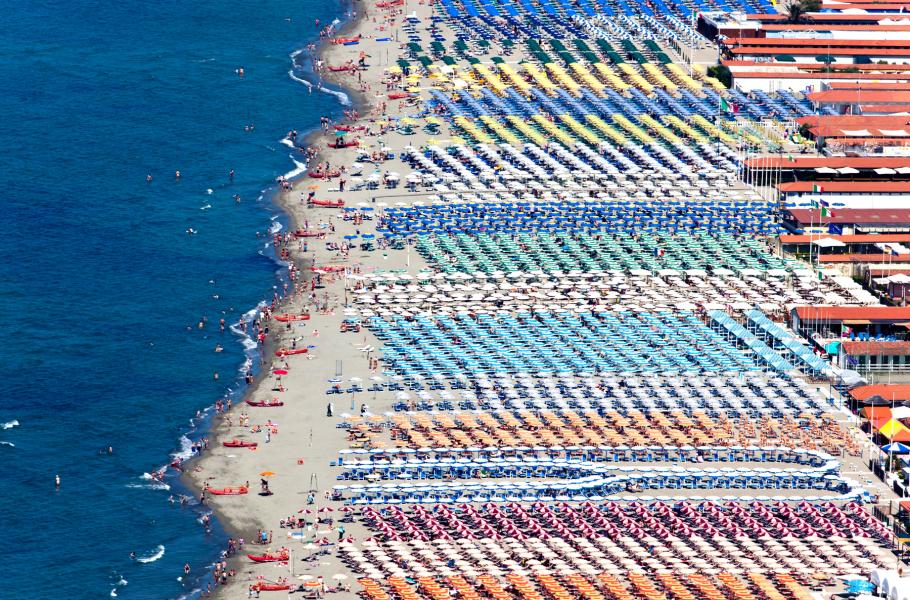 Letecký pohled z výšky 500 metrů na pláž v italském Toskánsku. Fotograf a pilot Alex S. MacLean (64) prozkoumal z ptačí perspektivy stovky kilometrů italského pobřeží, aby zdokumentoval vliv, jaký mají zástupy turistů na podobu krajiny.