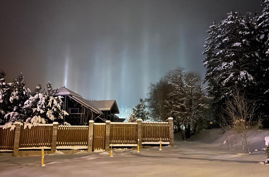 Světelné sloupy mohou být odrazem světla přicházejícího od Slunce, Měsíce, ale i z pozemních zdrojů, jako je třeba pouliční osvětlení. Na snímku světelné sloupy nad běloruskou vesnicí Raŭbičy. (foto: Wikimedia Commons, Dzmitry Suponau, CC BY-SA 4.0)