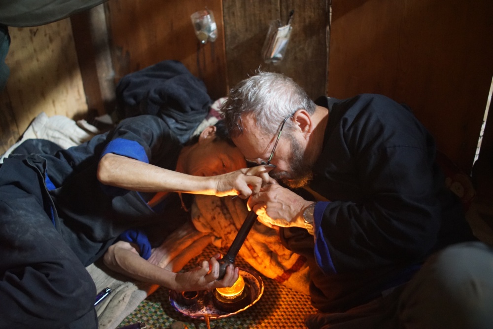 Chvilku tvrdil, že u nich opium už dávno není, a kroutil se, že se pěstování drog v zemi tvrdě trestá. Nakonec ale přiznal, že tři kuřáky zná, a vzal mě do jedné chýše. Tam byl chlapík s překrásným nádobíčkem na tácku, jak ho znám ze starých fotografií z dob Francouzské Indočíny. A prý že zrovna nemá co kouřit. Tak jsem mu strčil asi stovku a za chvilku byl balíček na místě. Chlapík nejprve naplnil opiovou lampu sádlem, začal něco roztloukat, třít a míchat – no byl to proces. A já jsem šťastně fotil a fotil a on zářil. Taky se není čemu divit: Kdy se komu poštěstí si zafetovat a dostat zaplaceno? (Směje se.)