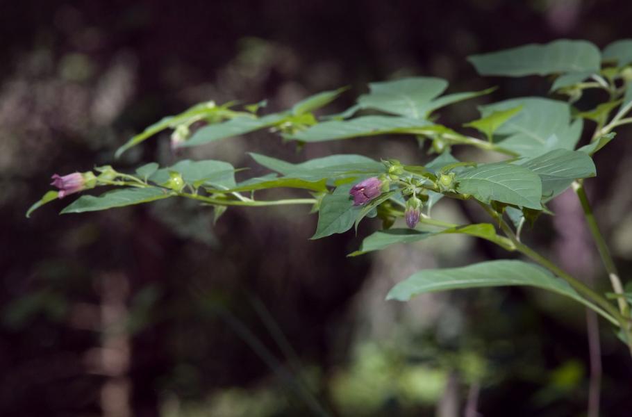 Trochu zvláštní stromkovitá rostlina, před níž stojíme, se podobně jako náprstníky pyšní zvonkovitými květy. Její zvonky jsou však růžovofialové a ty, které již odkvetly, začínají vytvářet zelené bobule. Doposud jsme se s tímto rostlinným druhem v naší přírodě nesetkali, takže ho nedovedeme určit. Až doma jsem si vyhledala, že jde o rulík zlomocný (Atropa bella-donna). Není u nás příliš hojný, takže pro mne šlo o první setkání.
