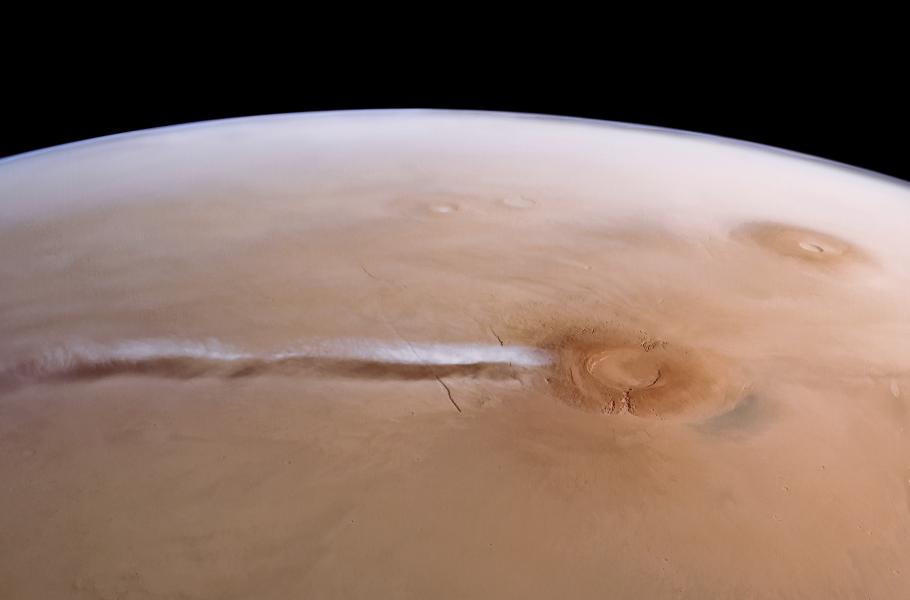 Orografický oblak nad marsovskou sopkou Arsia Mons, jak jej zachytila v létě 2018 sonda Mars Express. (foto: Wikimedia Commons, ESA/DLR/FU Berlin/J. Cowart, CC BY-SA 3.0)