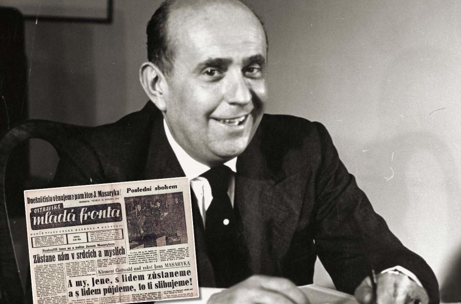 Usměvavý Jan Masaryk, jak ho znala veřejnost. Fotografie z období exilu za druhé světové války. Ve výřezu ukázka z reakcí tisku na Masarykův skon.