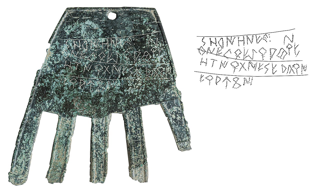 Ruka z Irulegy, bronzový artefakt starý asi 2 100 let, nese nápis v dávném jazyce, příbuzném dnešní baskičtině. (foto: Wikimedia Commons, Nafarroako Gobernua, CC BY-SA 3.0)
