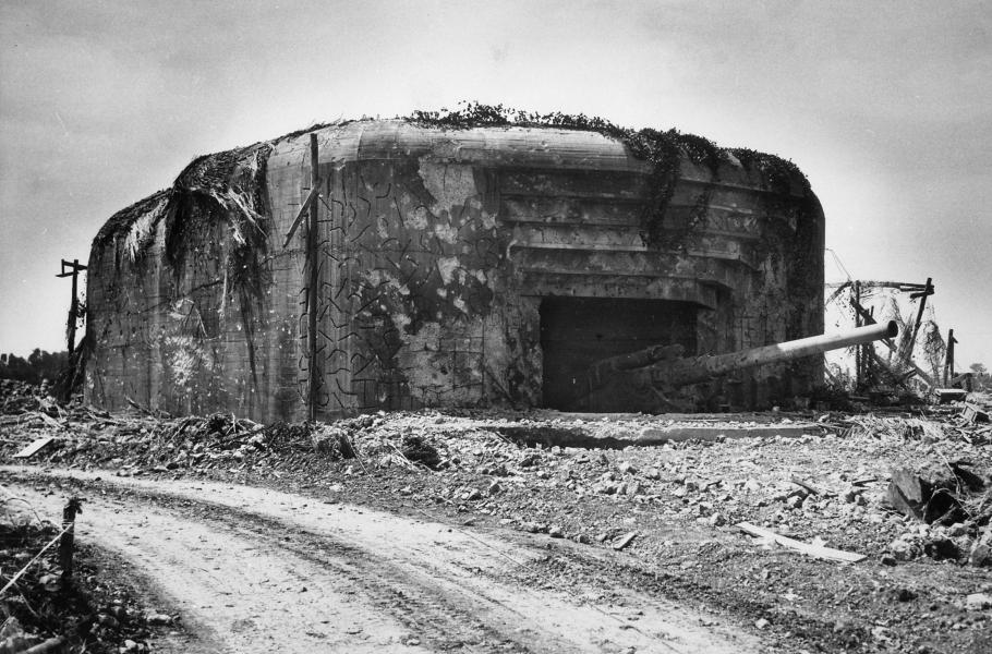 Do výstavby Atlantického valu Němci investovali obrovské prostředky, ani zdaleka jej ale nedokončili. Na snímku objekt baterie Crisbecq s 210mm kanonem z plzeňské Škodovky.