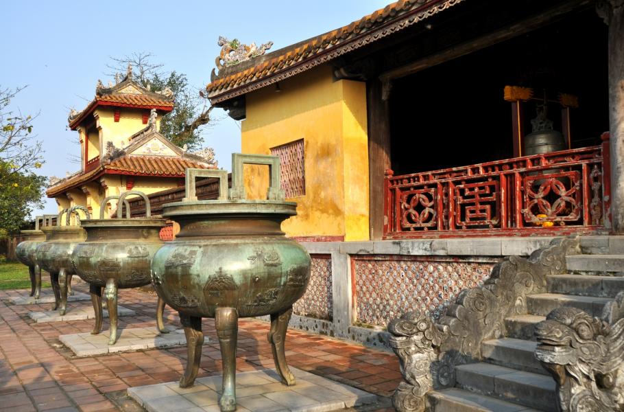 Nedaleko se z rovinaté krajiny vynořují mohutné kamenné hradby obklopené vodním příkopem, jež se vinuly v délce úctyhodných dva a půl tisíce metrů a chránily Zakázané město. Málokdo dokáže odhadnout, kolik staveb a chrámů za nimi najde, a fantazie tak pracuje naplno. Stačí pár kroků a za tmavou bránou se najednou rozprostře svět jako z vietnamských pohádek. Město začal budovat Nguyen Phuc Anh, který v roce 1802 převzal nad Vietnamem kontrolu a prohlásil se za císaře. Jen pár měsíců po usednutí na trůn si lokalitu nedaleko řeky zvolil za svou rezidenci a nařídil tam vybudovat komplex se stovkami budov, na němž pak pracovaly tisíce lidí.