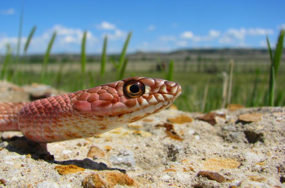 Jedna z barevných variant užovky pletené. Tento had má schopnost „vyčistit“ si v okamžiku nebezpečí ochrannou oční blanku od přebytečné krve v drobných žilkách. (foto: Shutterstock)