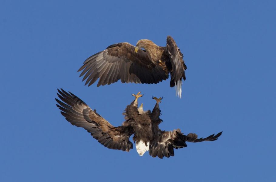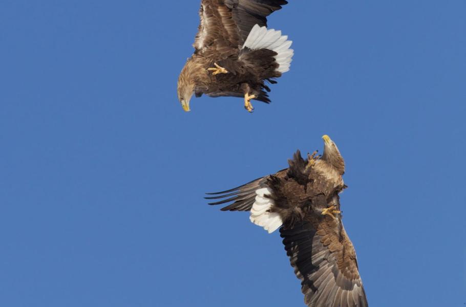 Orlí pár se za hlasitého křiku vznese vysoko do vzduchu a pak se dravci střemhlav spouštějí směrem na sebe…