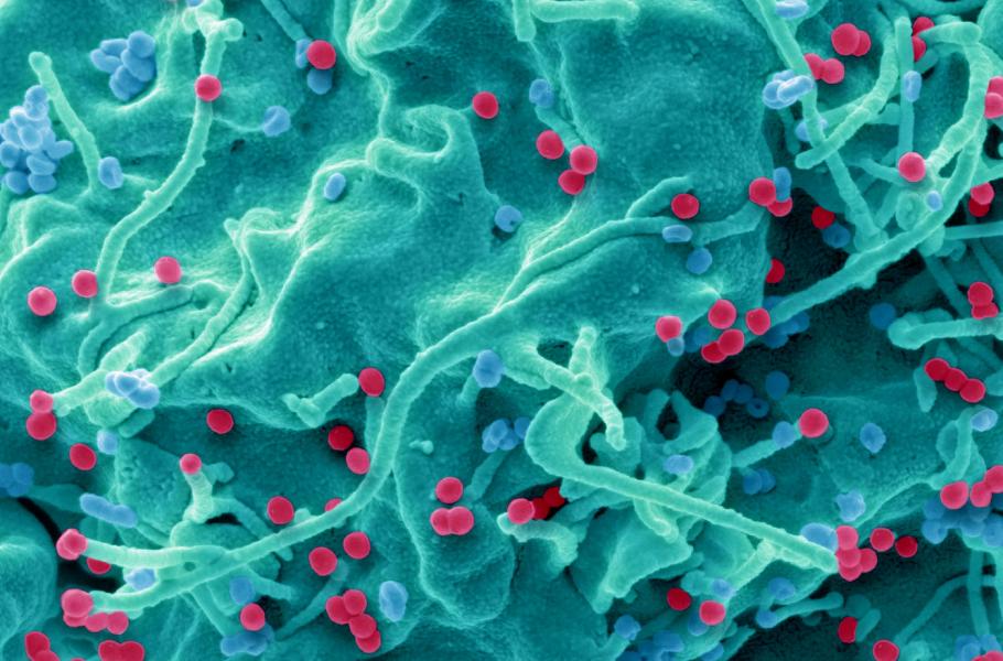 HIV virus napadá T-lymfocyty, tedy bílé krvinky ze skupiny lymfocytů. Tím postupně ničí imunitní systém člověka až do jeho úplného vyčerpání a rozvinutí onemocnění AIDS. I když je T-lymfocyt oproti drobounkému viru obr (na snímku z mikroskopu je vidět jen část jeho povrchu, posetého červenými tělísky viru), přesto si s jeho destruktivní silou nedokáže poradit. (Profimedia)