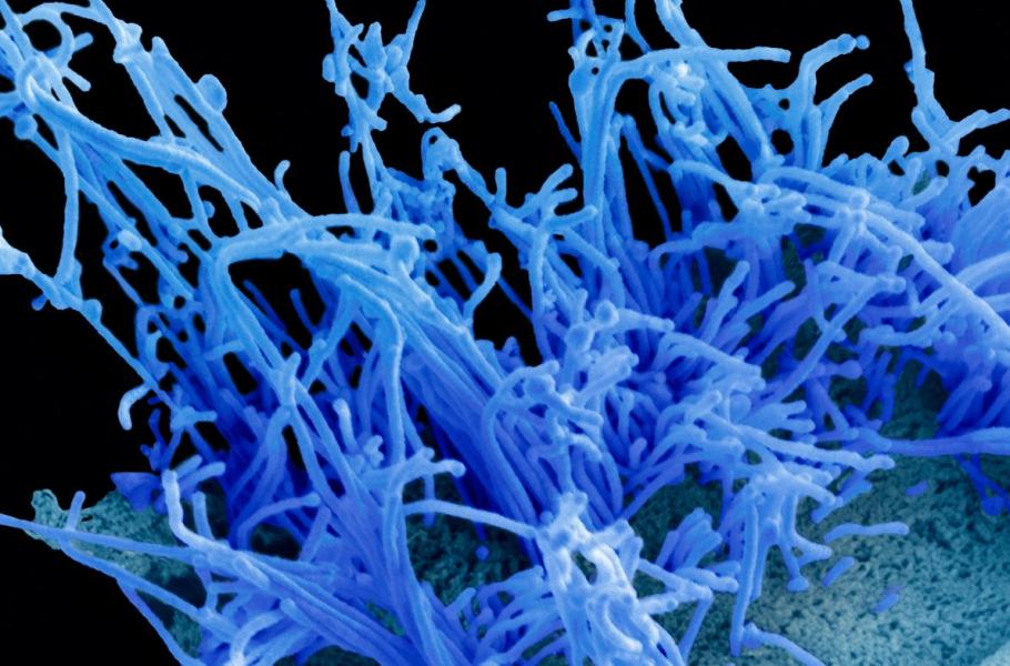 Zmutuje-li virus původně ptačí chřipky, může se stát, že získá schopnost napadnout i lidský organismus. Štěstí v neštěstí je, že se tímto typem chřipky (H5N1) člověk nakazí jen při kontaktu s drůbeží, mezi lidmi navzájem se virus nepřenáší. Chřipka po napadení buňky tvoří dlouhé vláknité částice, které jsou na snímku z elektronového mikroskopu zbarveny modře. (Profimedia)