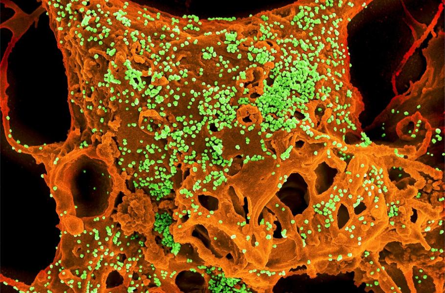 Snímek pořízený pomocí rastrovacího elektronového mikroskopu ukazuje virus SARS-CoV-2 (kulaté modré objekty) na povrchu buněk kultivovaných v laboratoři. SARS-CoV-2, také známý jako 2019-nCoV, je virus, který způsobuje onemocnění COVID-19. Uvedený virus byl izolován od pacienta v USA.