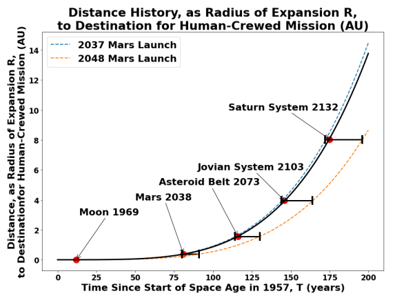 Od dobytí Marsu se odvíjejí jejich další úvahy. Kromě reálného pokroku letů do vesmíru bude podle nich hrát zásadní roli rozpočet NASA a rozvoj kosmických technologií. Rosen s kolegy očekávají, že kolem roku 2073 by lidé měli doletět do hlavního pásu planetek a Jupiter nás bude čekat kolem roku 2103. Pak přijde na řadu plynný obr a jeho velkolepé prstence. Jako nebližší termín návštěvy pozemšťanů u Saturnu vědci stanovili rok 2132 (v případě zpožděného scénáře pak o 20 let později).
