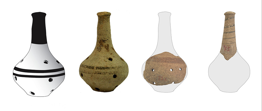 Celkem bylo identifikováno 19 fragmentů s rukojetí. Většina z nich byla dutá, což naznačuje, že sloužily ke chrastění – uvnitř byly pravděpodobně drobné kamínky či kousky vypálené hlíny. Tato výplň vydávala měkký, tlumený zvuk – podobně jako dnešní plastová chrastítka.