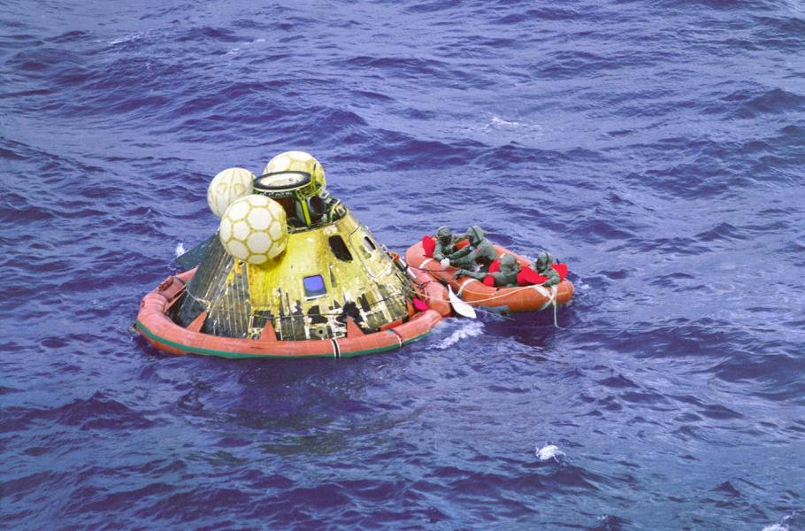 Velitelský modul Apollo se na širém moři choval jako malá plachetnice a klouzal po vlnách různými směry: zastavit jej a dostat astronauty bezpečně ven představovalo i za ideálního počasí velkou výzvu. Původní plán přitom počítal s vyzvednutím Apolla i s posádkou na palubu letadlové lodi, kde by pak astronauti prošli speciálním rukávem do karanténního modulu. Panovala totiž obava, aby na Zemi nezavlekli nějaké nebezpečné viry nebo bakterie. Jenže uvedený scénář nebylo možné realizovat, protože Apollo doznalo po požáru v lednu 1967 značných změn a jeho hmotnost výrazně vzrostla. Vyzvednout jej na palubu letadlové lodi by tudíž bylo obtížné, proto ho nejprve musela opustit posádka – a právě to měl zajistit Clancy Hatleberg.