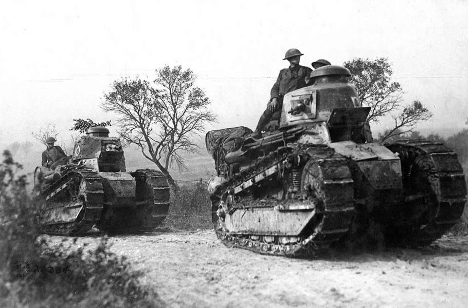 Francouzské tanky Renault FT-17 s americkými osádkami míří v létě 1918 během bitvy o Argonský les do boje.