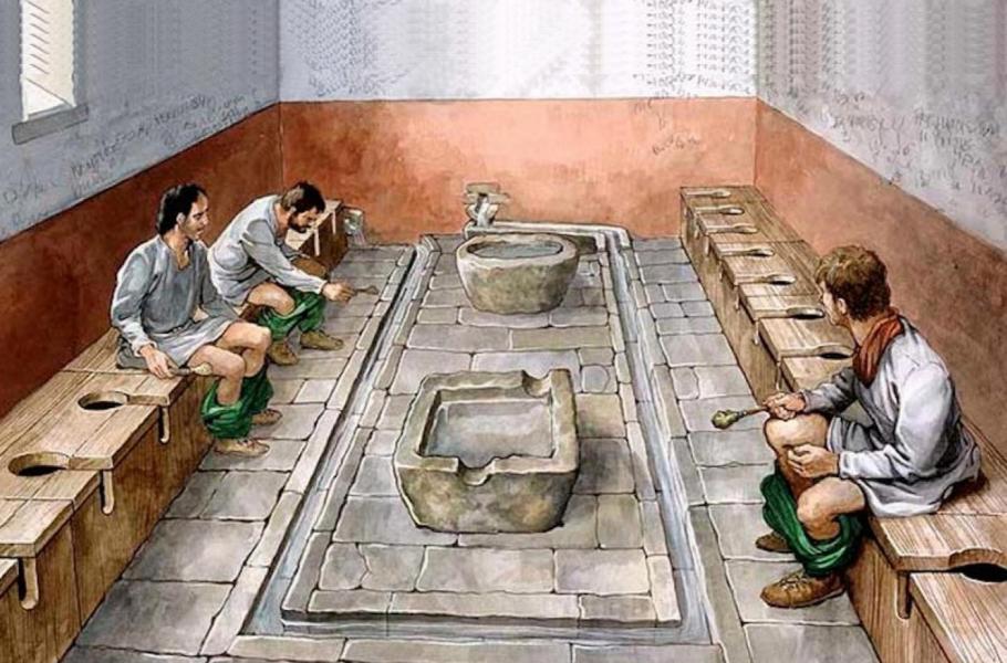 Kamenná latrína v římské provicii Británie (kolem roku 124 našeho letopočtu). Římané brali chození na toaletu jako společenskou událost. Setkávali se zde s přáteli, vyměňovali si názory a dozvídali se zde novinky.