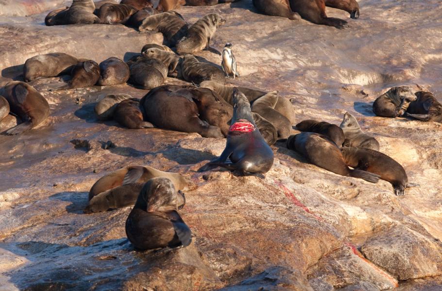 „Seals, nine o'clock!“ protne náhle napjatou atmosféru výkřik. Otáčím se daným směrem a v dálce asi sto padesáti metrů vidím skupinu lachtanů vracejících se k ostrovu. Kolik jich může být… tři, čtyři? Zběsile vyskakují z vody a rychlé manévry do stran prozrazují, že ve vodě nejsou sami. Jeden za druhým vylétávají nad hladinu, a co nejrychleji se snaží dostat ke břehu. Každý výskok je provázen hlasitým lachtaním zabučením, při němž tuhne krev v žilách.