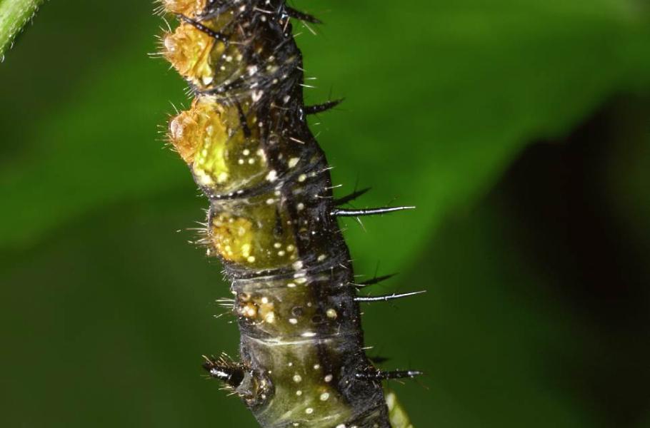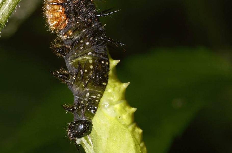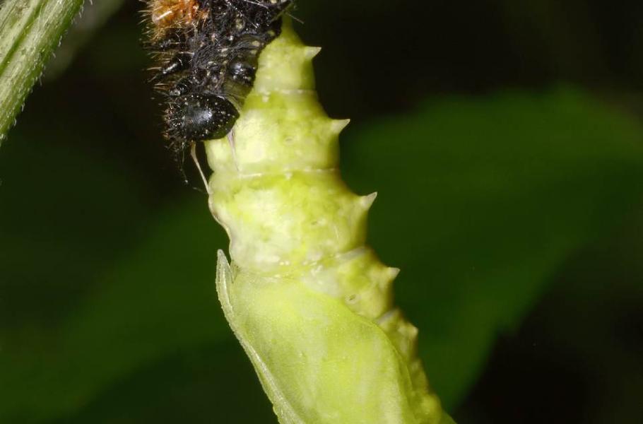 Dospělá housenka (babočka paví oko) se zadečkem zavěsila na stopku, kterou si upředla a čeká na kuklení. Tělo se protahuje