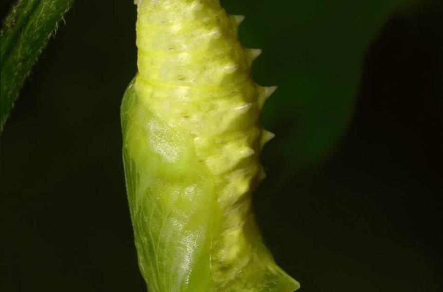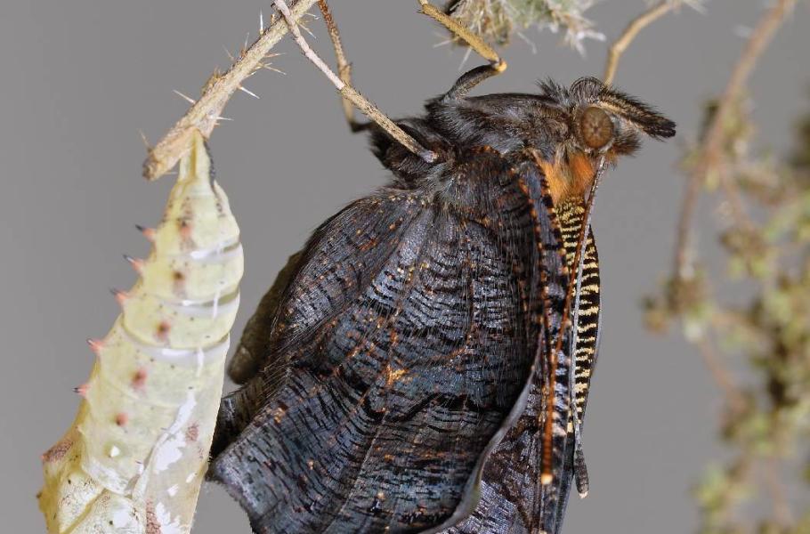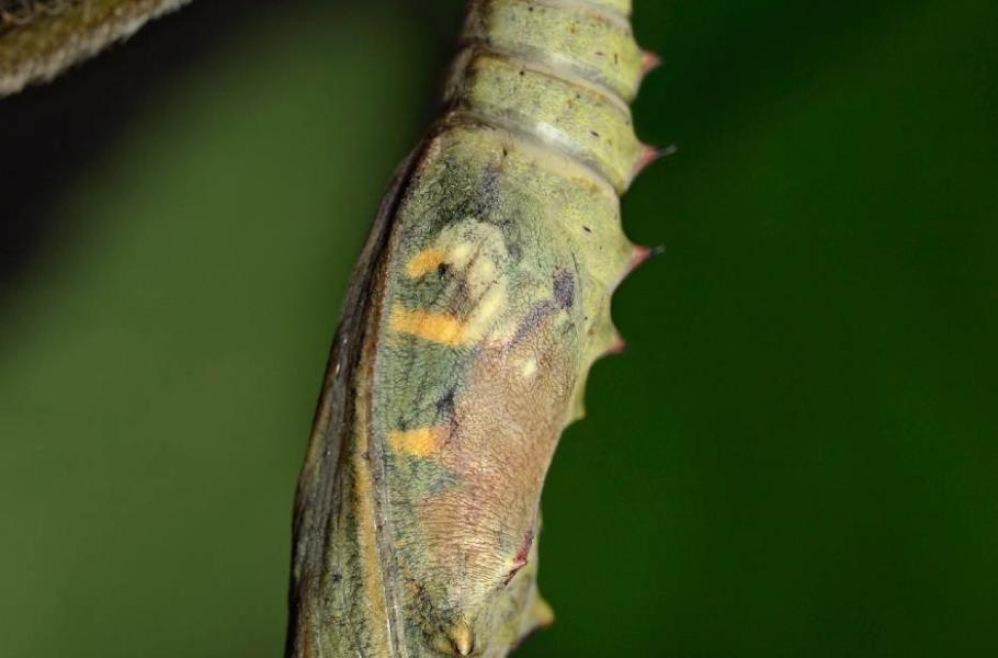 Kukla těsně před líhnutím, prosvítá kresba křídel