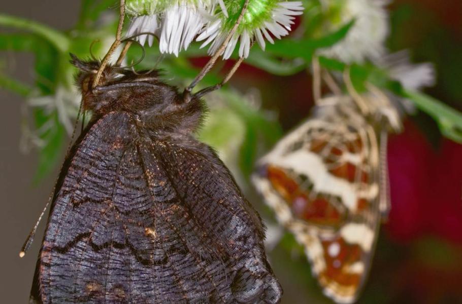 Paví oko s téměř vypnutými křídly, v pozadí babočka síťkovaná