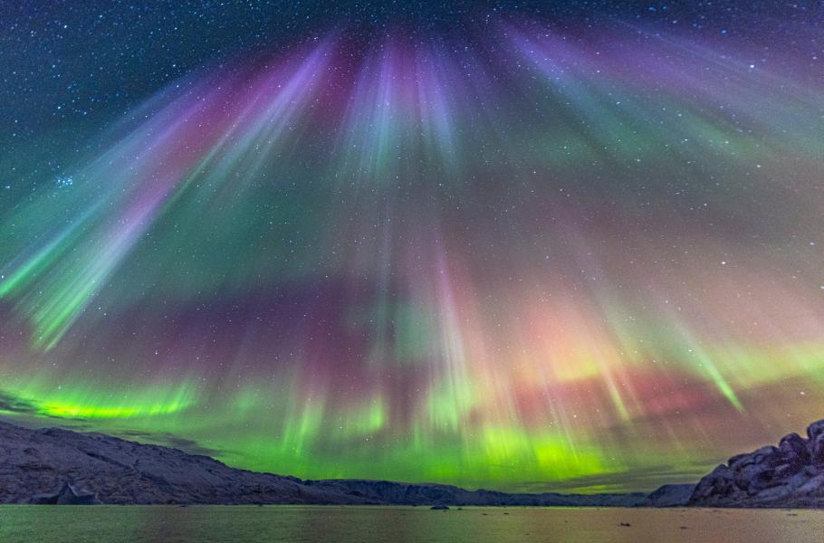 Polární záře se na nebi objevují, když nabité částice slunečního větru pronikají do zemské atmosféry a srážejí se s přítomnými atomy kyslíku či dusíku. První zmíněný prvek pak většinou odpovídá za zelené a červenooranžové zbarvení, zatímco dusík má na svědomí modré, fialové a červené odstíny. (foto: Profimedia)