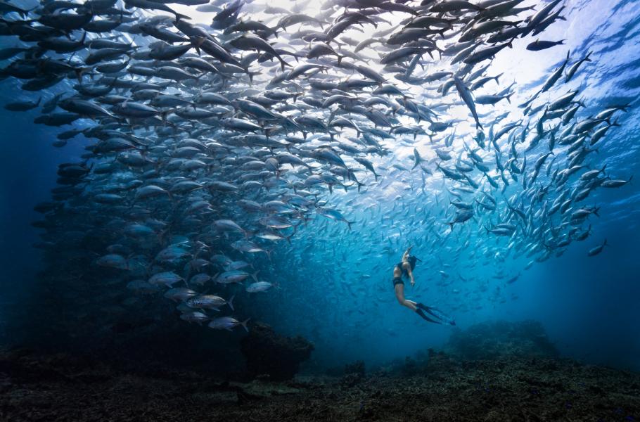 Snem Khaichuina Sima bylo zachytit splynutí člověka a života pod hladinou. Požádal proto svou ženu, zda by se nepřiblížila k hejnu kranasů modroploutvých – a pak už jen stačilo počkat na dokonalou chvíli.
