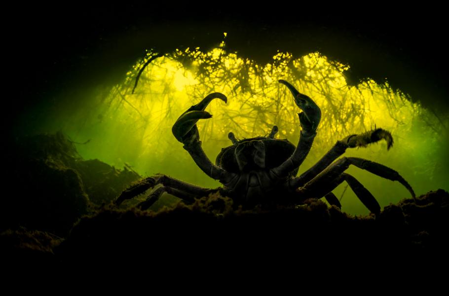 Trup kraba modrého měří okolo dvaceti centimetrů, nicméně správný úhel pohledu a světlo pronikající z podvodní jeskyně propůjčují vyfotografovanému exempláři gigantické rozměry: S roztaženými klepety stojí v proudu a čeká na kořist.