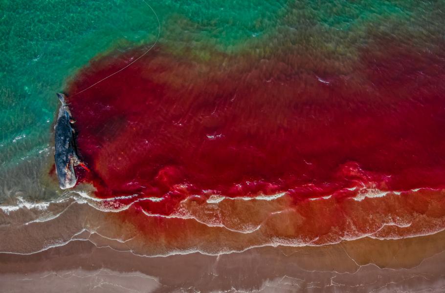 Vorvaň obrovský může měřit i pětadvacet metrů, a když tedy moře vyplaví na pláž tělo mrtvého jedince, jedná se o hrozivé dílo zkázy. Krvavá řeka, jež z nebohého tvora vyvěrala, měřila podle fotografa půl druhého kilometru.