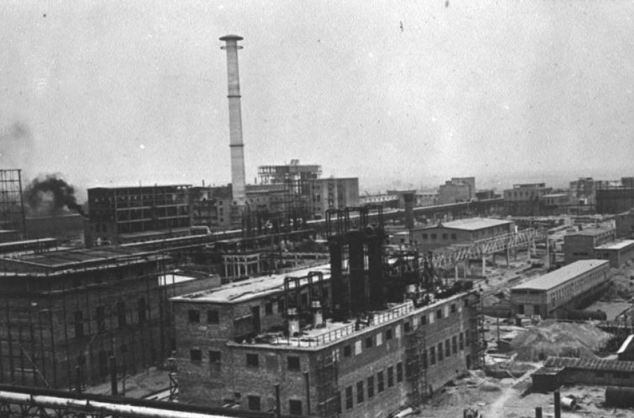 Rozestavěná továrna IG Farben v Osvětimi-Monowicích: vyráběl se zde kaučuk, syntetický benzin, barviva i léčiva.