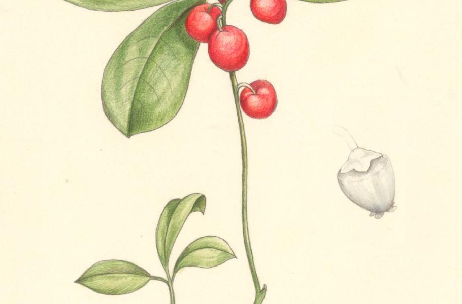 Tento nízký plazivý stálezelený keřík se šíří podzemními výběžky a vytváří husté koberce. Listy jsou lesklé, tmavě zelené, v zimě se můžou barvit do purpurova. Plody jsou červené, a protože je nežerou ptáci ani hlodavci, vydrží na rostlině až do jara.