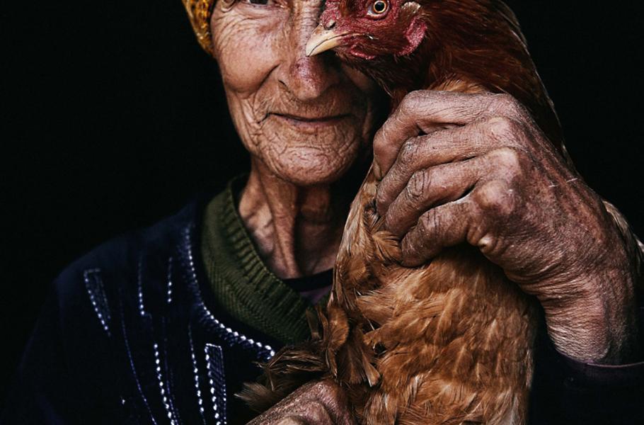 Veselá sedmdesátnice ani na stará kolena nedá dopustit na svou zahradu a s láskou se stará o domácí zvířata – obzvlášť o drůbež. Ahmed El Hanjoul ji zachytil se slepicí u tváře, jako by se dívala na svět jejíma očima. (foto: SIPA, Ahmed El Hanjoul)