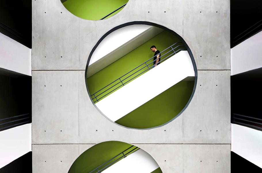 Schodiště bytových komplexů bývají sterilní a strohá. Nina Papioreková však dokázala najít unikátní místo, kde v pravý okamžik zachytila jednoho z nájemníků. Kompozice olivové barvy a betonu jí vynesla uznání poroty. (foto: SIPA, Nina Papioreková)
