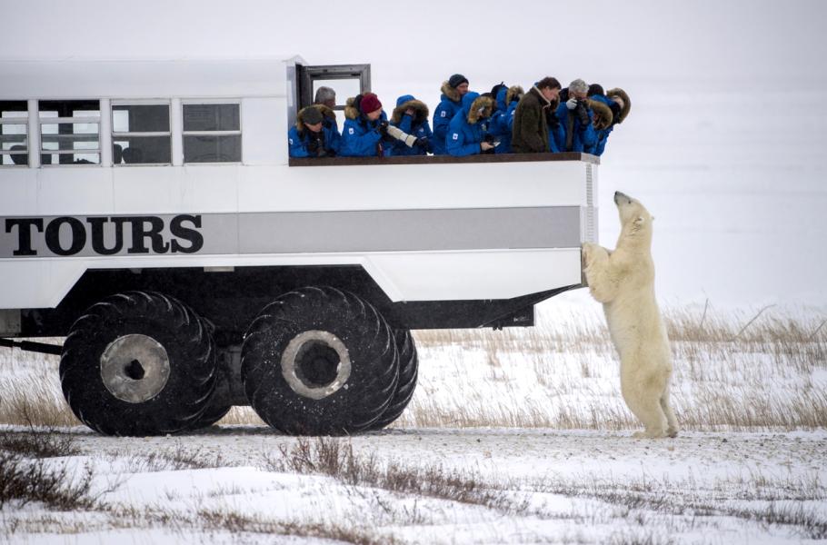 Každý rok mezi říjnem a listopadem se lední medvědi vydávají k zamrzlému Hudsonovu zálivu v Kanadě za potravou. Ve stejné době tam proto turistické agentury vozí zájemce v otevřených nákladních vozech, aby se mohli k šelmám přiblížit doslova na dosah. (foto: SIPA, Bob Chiu)