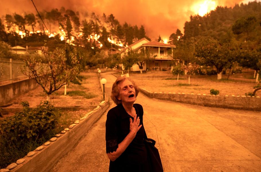 Při nejdelší vlně veder za posledních třicet let ukazovaly řecké teploměry až 47 stupňů a tamní lesní porosty zachvátily stovky požárů. Z ostrova Euboia se musely evakuovat tisíce obyvatel i turistů a 81letou Kritsiopi Panayiotaovou takto zdrtil nevyhnutelný osud jejího domu, stojícího plamenům v cestě. (foto: SIPA, Konstantinos Tsakalidis)