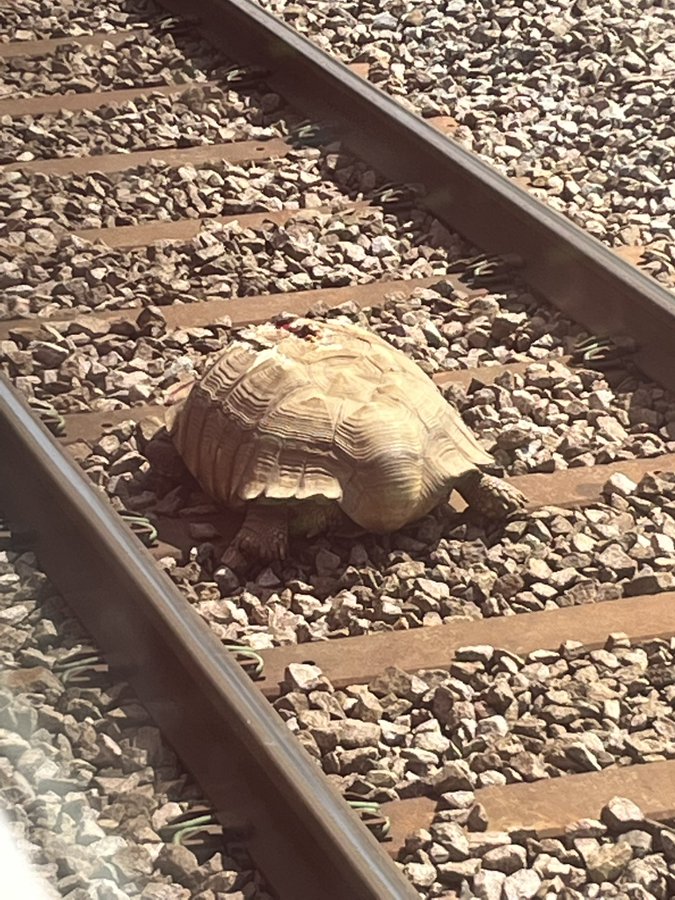 Železniční společnost Greater Anglia, která zajišťuje spojení mezi Londýnem a východní Anglií, na twitteru oznámila, že vlaky mezi Norwichem a letištěm Stansted byly dnes na více než hodinu zastaveny kvůli „obří želvě“.