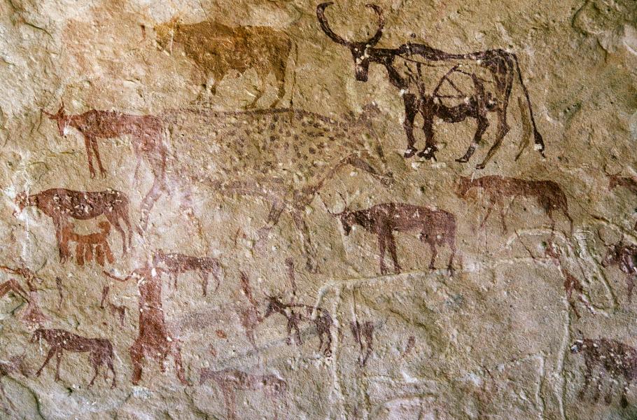 Poslední doba ledová skončila před deseti tisíci lety a tehdy se Sahara také opět zazelenala. A co víc, zmíněné období nazývané holocén (nejmladší geologická éra Země, zatím poslední doba meziledová) přineslo i náhlý rozkvět kultury v lidských osadách. Severní Afriku v té době obývali lovci, kteří se zhlédli ve výtvarném umění. Skalní stěny zdobili rytinami a malbami zvířat, postav i fantastických stvoření a vytvářeli šperky z kamene a ze skořápek pštrosích vajec. Tehdejší lidé se navíc již nespokojili jen s dary přírody: začali vyrábět nádoby z keramiky a později místo lovu domestikovali dobytek, takže před 7,5 tisíci lety pastevci se svými stády doslova zaplavili celou Saharu.
