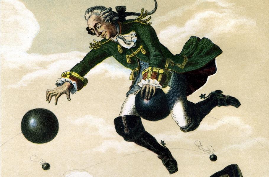 Baron Prášil na dělové kouli, ilustrace Augusta von Willa z roku 1872. (zdroj: Wikimedia Commons, August von Wille, CC0)