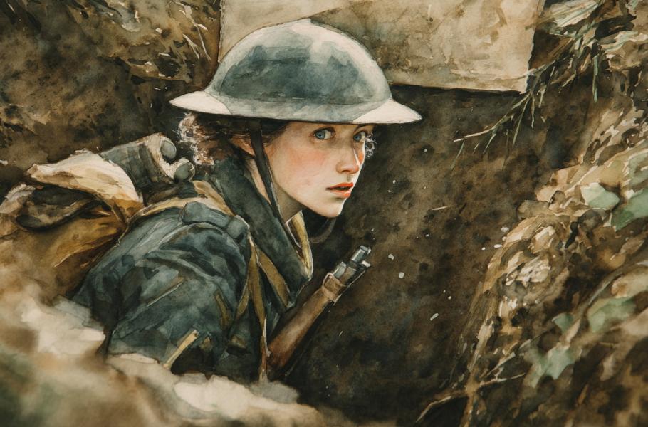 Dorothy Lawrence (1896–1964) ve snaze působit mužsky údajně používala i kyselinu, po níž měla její pokožka zhrubnout. (ilustrace: Midjourney AI, PDM 1.0)