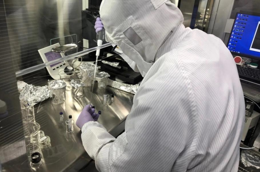 Hiroshi Naraoka odebírá vzorky z planetky Ryugu v čisté místnosti standardu ISO 5. Místnosti tohoto standardu jsou určené pro kritické aplikace, existují ale nejméně čtyři ještě „přísnější“ standardy. (foto: JAXA/NASA, CC BY-SA 4.0)