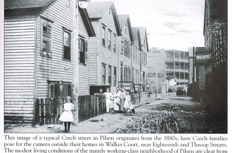 Pohled na české domy ve Walker Court, typické ulici v chicagské Plzni v osmdesátých letech 19. století