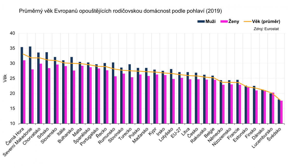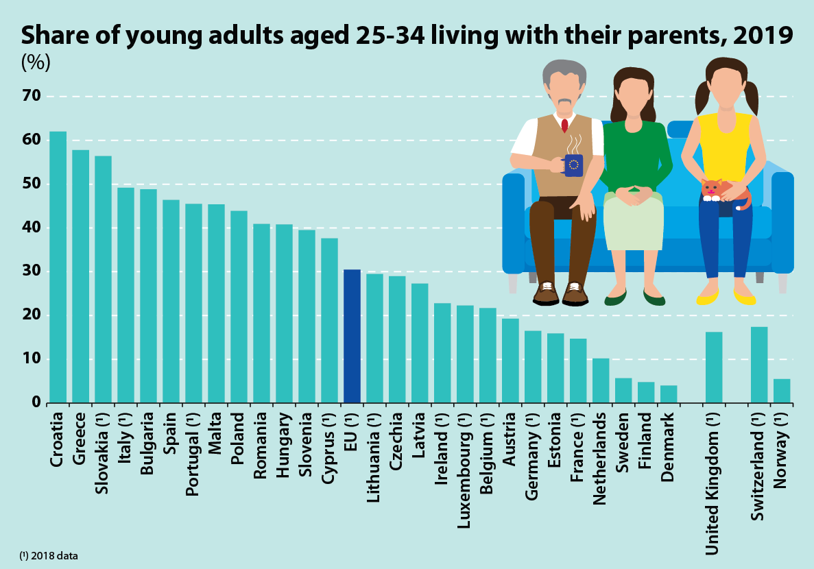 Příklad třicetiletého muže žijícího u rodičů není takovou výjimkou, jak by se mohlo zdát. Podle dat agentury Eurostat se podíl mladých lidí ve věku 25 až 34 let, kteří stále žijí se svými rodiči, pohyboval v evropských zemích od méně než 10 % v Dánsku (4 %), Finsku (4,8 %), Švédsku (5,7 %) a v Norsku (5,8 %) až po více než polovinu na Slovensku (55 %), v Řecku (57,8 %), v Chorvatsku (62,2 %) a Severní Makedonii (66,8 %). Češi se s 29 % zařadili těsně pod průměr evropské sedmadvacítky.