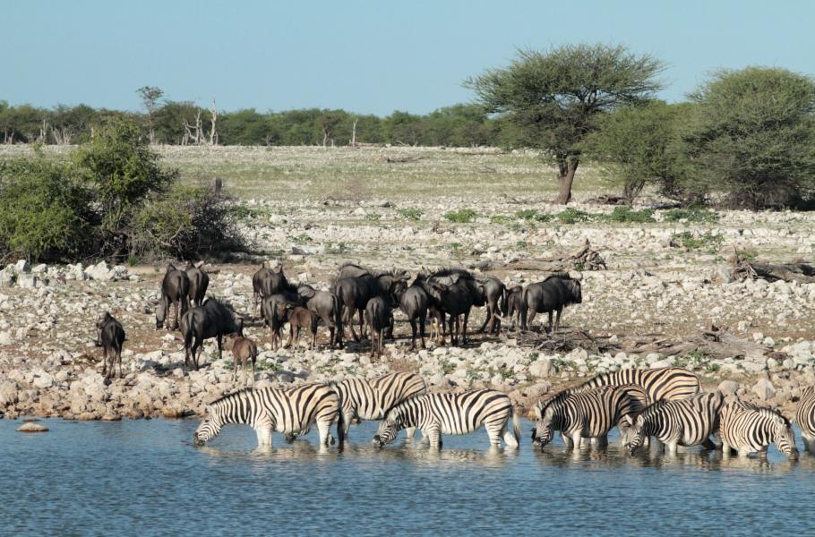 Slunce visí nízko nad obzorem a Etosha se chystá na další noc. Sotva jsem otevřel dveře od auta, slyším zvláštní zvuk připomínající vysoké volání nějakého ptáka. Výkřiky se ozývají od napajedla, které je těsně vedle kempu a je od něj odděleno kamennou zdí. V napajedle, které vypadá jako malý jihočeský rybníček, jsou vedle sebe naskládané zebry. Stojí po kolena ve vodě, nervózně podupávají, hltavě pijí a čas od času vystrašeně zahýkají. To je ten zvuk, který mě vytáhl od vozu.