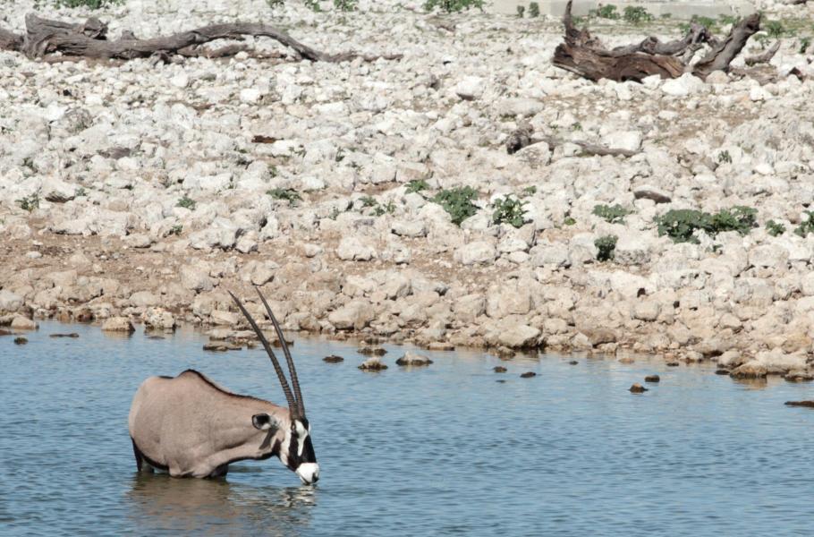 Napít se přišla i malá skupina antilop skákavých (Antidorcas marsupialis). Těmto malým půvabným zvířatům s krásnýma velkýma očima sekunduje přímorožec jihoafrický (Oryx gazella). Přímorožec si nejprve pyšně vykračuje po břehu, pak ale vejde do vody a prochází se v ní jako majitel napajedla.