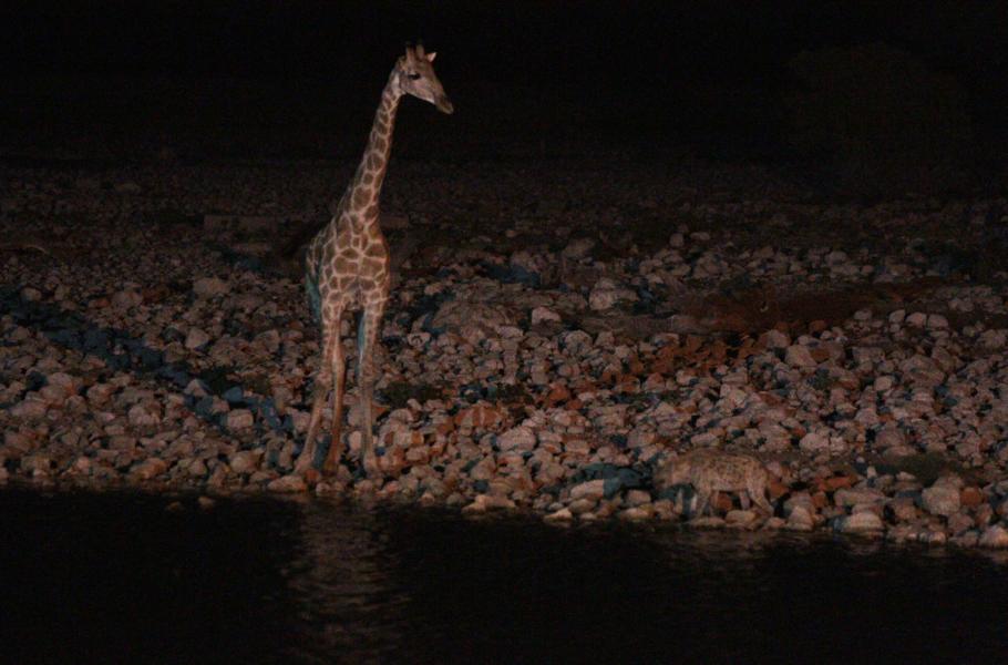 Nosorožec má respekt snad jen ze slonů a jakmile afričtí obři zmizeli, znovu k vodě přichází pro další hlt. Ze tmy přímo proti nám se vynořují další zástupci megafauny – žirafy. Chvíli stojí a vyčkávají. Pak se rozestaví kolem napajedla, široce se rozkročí a začínají pít. Je na nich ale znát neklid. Co chvíli sebou trhnou a poplašeně zvedají hlavy. Po chvilce se z pravé strany přiloudá pravděpodobný původce jejich zneklidnění – hyena skvrnitá (Crocuta crocuta), jejíž kožich se dočista ztrácí na kamenitém pozadí. Napjatá situace ale vyústí v poklidný „čajový dýchánek“. Hyena se zastaví kousek od jedné z žiraf, klidně se napije a pak loudavým krokem mizí ve tmě.