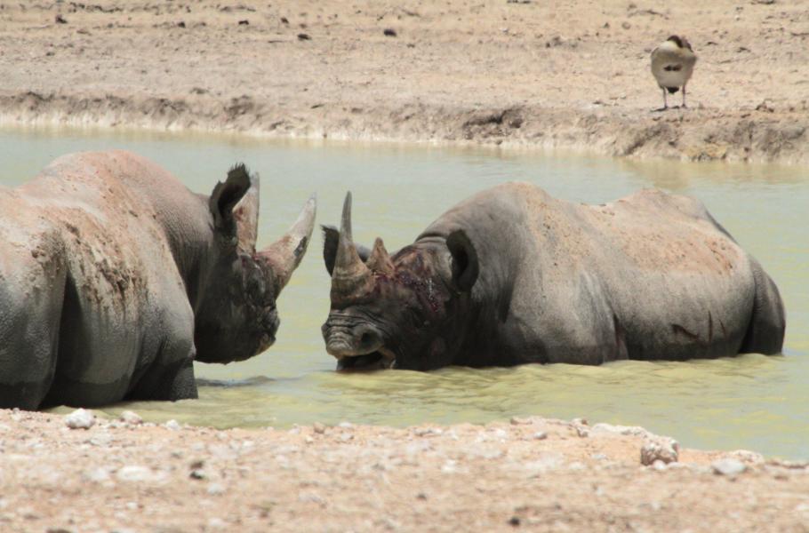 Cesta trvá jen chvilku, napajedlo leží kousek od hlavní cesty. Před lety jsem tu potkal unavenou a nemocnou lvici. Teď vyhlížím bojující nosorožce a už je vidím. Dva samci stojí proti sobě uprostřed napajedla a nehýbají se. Vypadá to, že je po boji. Jeden ze samců co chvíli dlouze zabučí. V tom zvuku je cítit bolest a beznaděj. Zdá se, že zápas byl opravdu nelítostný.