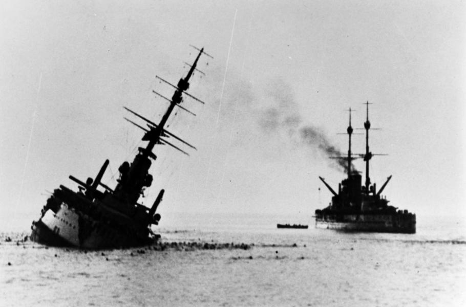 Potápějící se Szent István v červnu 1918 po zásahu italských torpéd, napravo SMS Tegetthoff. (foto: Wikimedia Commons, International Naval Research Organization, CC0)
