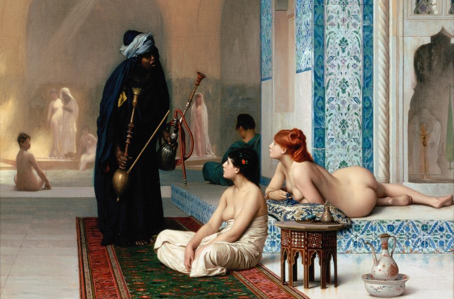 Bazén v harému, obraz Jeana-Léona Gérôma z roku 1876. Podobné barevné erotické fantazie, v nichž harém obývaly většinou nahé bílé dívky, čekající na vůli svého snědého pána a velitele, byly častým námětem evropských umělců.