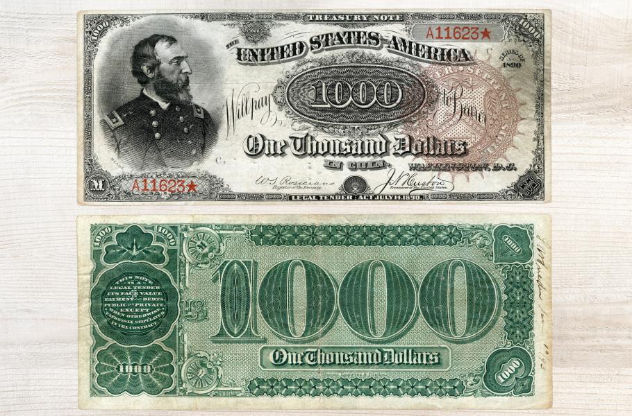 Vedle nejdražší mince planety si americká platidla připsala také rekord v případě nejcennější bankovky. Stala se jí tisícovka z roku 1890, které se pro tvar a zbarvení nul na zadní straně začalo přezdívat „velký meloun“. V roce 2014 se jedna perfektně zachovalá vydražila za 3,29 milionu dolarů, přičemž se pod její cenu podepsala nejen vysoká nominální hodnota, ale samozřejmě také stáří platidla. Jeho hodnotu zvedá rovněž skutečnost, že se v soukromých sbírkách nacházejí pouhé tři kusy. (Wikimedia Commons, National Numismatic Collection Smithsonian Institution, PDM 1.0)