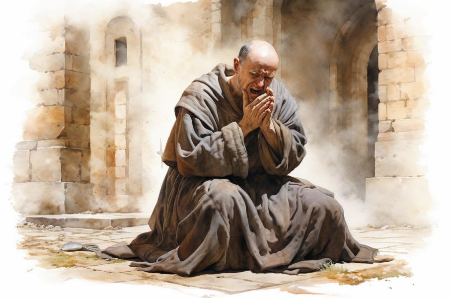 U lehkých provinění musel cisterciácký mnich veřejně přede všemi prosit za odpuštění, aniž by měl možnost se hájit. (ilustrace: Midjourney AI, CC0)