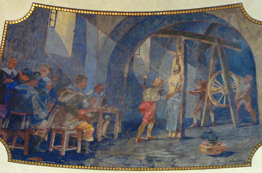 Freska znázorňující mučení Jana Sarkandera v Holešově. Freska se nachází v Sarkandrově kapli v Olomouci. (zdroj: Wikimedia Commons, Michal Maňas, CC BY 4.0)