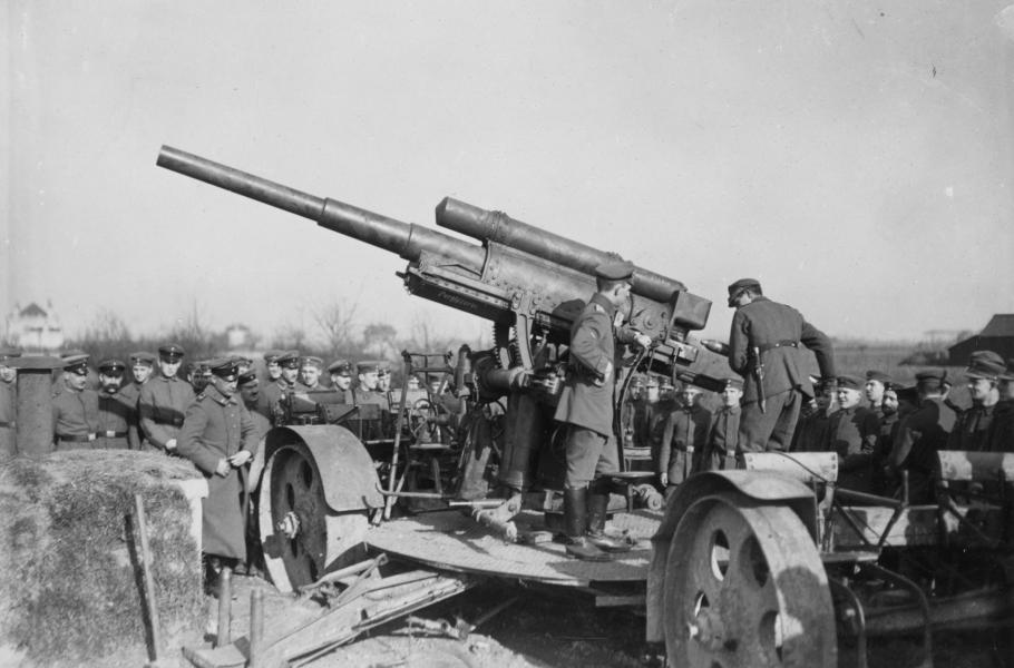 Německá armáda prováděla za první světové války experimenty s montáží běžných polních děl na nové lafety s vyšším rozsahem náměru, ale zásahy představovaly spíš otázku velkého štěstí, jelikož úsťová rychlost těchto děl byla prostě příliš nízká na to, aby se dalo efektivně mířit. Navíc neustále rostly výkony letadel, která létala rychleji a ve větších výškách, takže logicky rostly i požadavky na protiletadlové kanony.